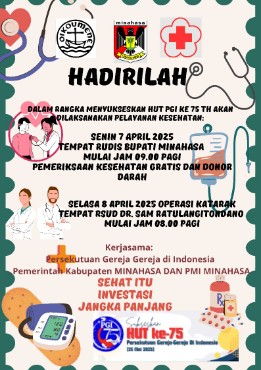 MINAHASA – Dalam rangka memperingati Hari Ulang Tahun ke-75 Persatuan Gereja-gereja di Indonesia (PGI), digelar kegiatan pelayanan kesehatan bagi masyarakat, yang berlangsung pada Senin, 7 April 2025. Kegiatan ini bertempat di Rumah Dinas Bupati Minahasa dan dimulai pukul 09.00 WITA.