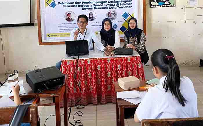 Tim dosen muda tersebut melaksanakan Pelatihan dan Pendampingan Kesiapsiagaan Bencana berbasis Space Syntax di SMP Katolik Bunda Hati Kudus, Woloan, Kota Tomohon, Rabu (13/8/2025). Sekolah ini berada di kawasan rawan erupsi Gunung Lokon, salah satu gunung berapi aktif di Sulawesi Utara.