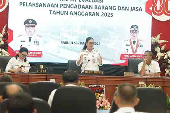 MINAHASA – Pemerintah Kabupaten (Pemkab) Minahasa melalui Wakil Bupati, Vanda Sarundajang, menegaskan komitmennya untuk mewujudkan tata kelola pemerintahan yang bersih dan transparan, khususnya dalam pengelolaan pengadaan barang dan jasa (PBJ). Hal ini disampaikannya saat membuka Rapat Evaluasi Pelaksanaan PBJ Tahun Anggaran 2025, Rabu (3/9/25), di Ruang Sidang Kantor Bupati Minahasa.