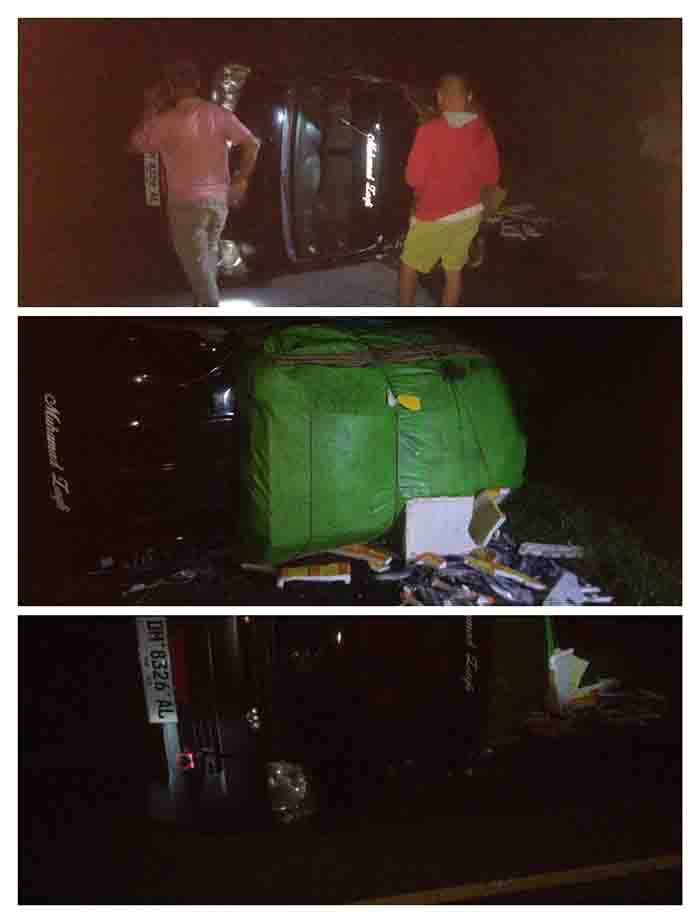 Kecelakaan diduga terjadi setelah ban belakang kendaraan pecah, menyebabkan mobil oleng dan akhirnya terbalik di lokasi kejadian.