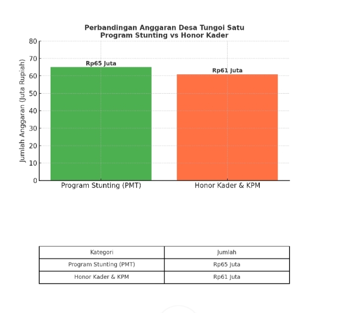 Saat dikonfirmasi, Sangadi Tungoi Satu, Sutrisno Ungko, mengakui bahwa anggaran PMT desa tahun berjalan mencapai Rp65 juta. Sementara untuk honorarium kader posyandu dan KPM mencapai Rp61 juta, dengan jumlah kader yang mencapai 17 orang, masing-masing menerima Rp300 ribu per bulan.