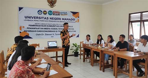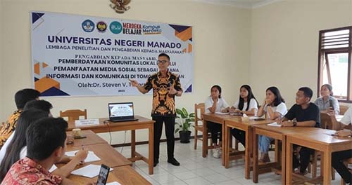 TOMOHON – Dosen Program Magister Administrasi Negara Universitas Negeri Manado (Unima), Dr. Steven V. Tarore, S.Pd., M.A.P., melaksanakan kegiatan Pengabdian Kepada Masyarakat (PKM) bertema “Pemberdayaan Komunitas Lokal Melalui Pemanfaatan Media Sosial”, bekerja sama dengan Pemuda GMIM Syalom Lansot, Rabu (24/9/2025).