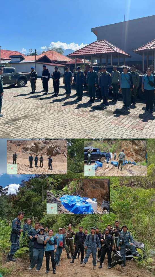 Di lokasi, tim mendapati satu keluarga terdiri dari suami, istri, dan anak yang bertugas sebagai penjaga tenda di area tambang. Tidak ditemukan aktivitas penambangan saat itu, namun tim menemukan sejumlah barang bukti di antaranya solar, genset, alkon, kapur, terpal, beberapa tenda, serta dua unit ekskavator yang disembunyikan di balik semak.