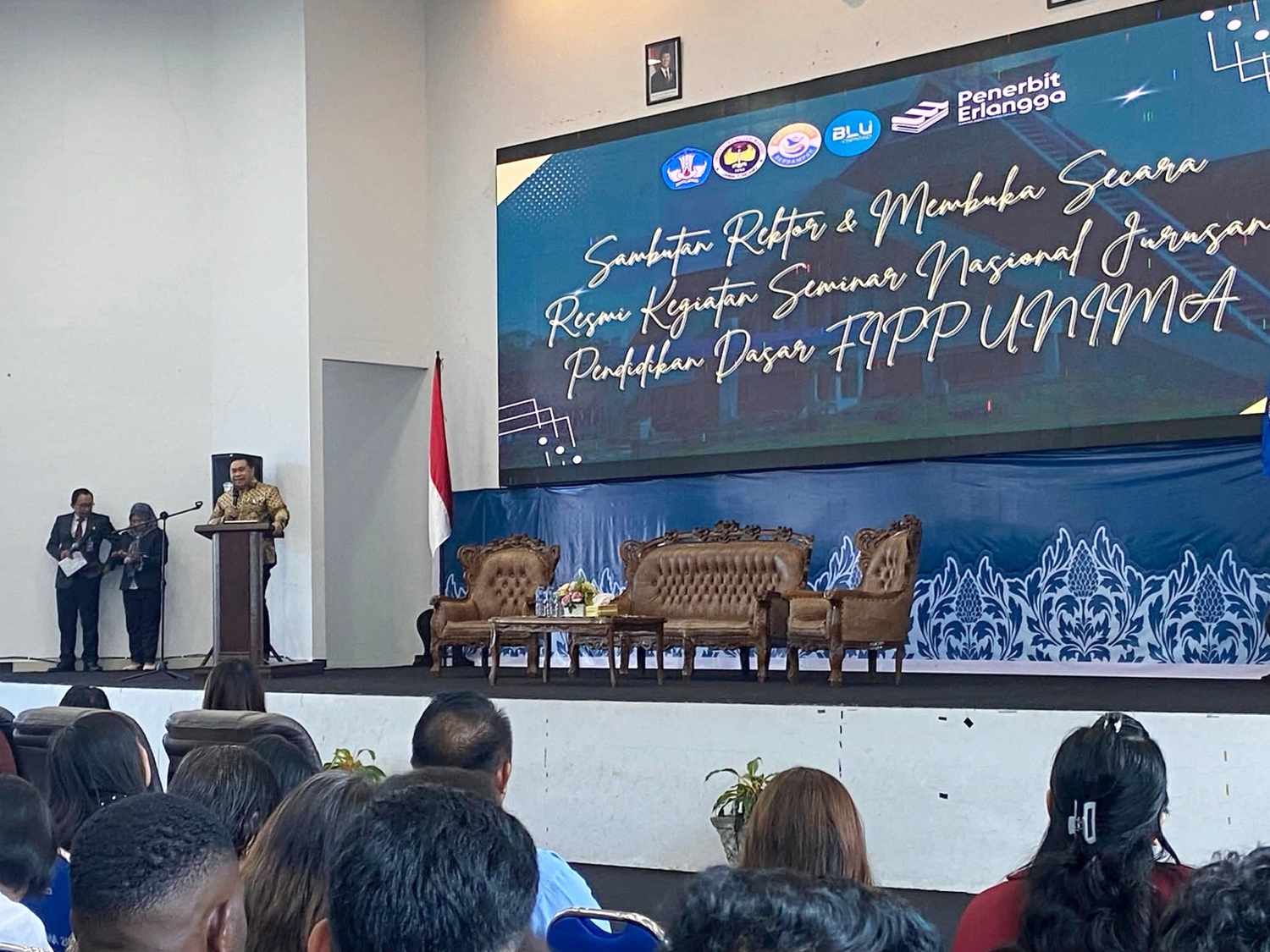 Wakil Rektor Bidang Akademik Unima, Prof. Dr. Mister Gidion Maru, M.Hum., dalam sambutannya menyampaikan apresiasi atas terselenggaranya seminar nasional ini sebagai wujud nyata kolaborasi antara akademisi dan pemerintah dalam memperkuat kualitas pembelajaran di jenjang pendidikan dasar.