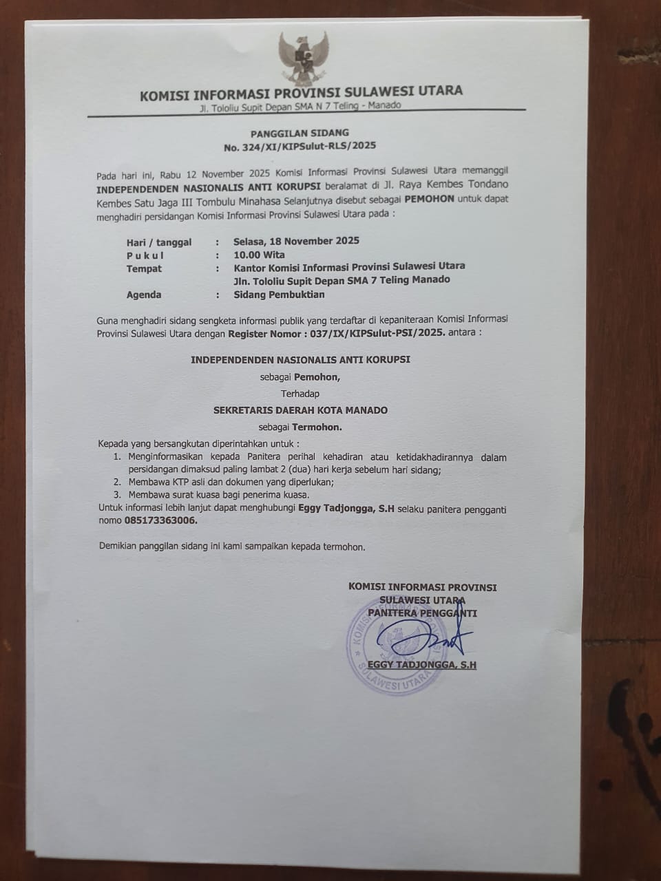 Manado, 18 November 2025 — Lembaga Swadaya Masyarakat Independen Nasionalis Anti Korupsi (INAKOR) Sulawesi Utara menyoroti secara serius ketidakhadiran Sekretaris Daerah (Sekda) Kota Manado dalam beberapa agenda sidang Komisi Informasi Provinsi Sulawesi Utara. Sidang terkait sengketa pelayanan informasi publik dengan Register Nomor: 037/IX/KIPSulut-PSI/2025 itu berkali-kali tidak dihadiri langsung oleh Sekda, meskipun panggilan resmi telah diterbitkan oleh Komisi Informasi.
