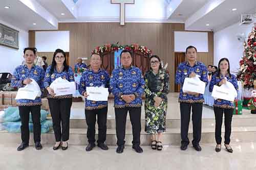 Mengakhiri rangkaian ibadah, Pemkab Minahasa menyerahkan bantuan dan Diakonia Natal kepada warga kurang mampu serta anak-anak stunting sebagai wujud kepedulian sosial di momen Natal.