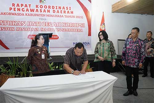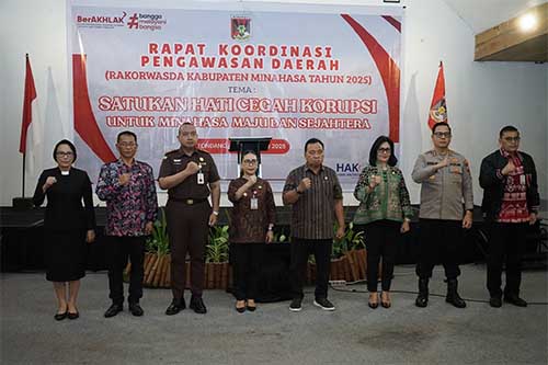 MINAHASA – Bupati Minahasa Robby Dondokambey, SSi, MAP, bersama Wakil Bupati Vanda Sarundajang, SS, resmi membuka kegiatan Rapat Koordinasi Pengawasan Daerah (RAKORWASDA) yang diselenggarakan Inspektorat Daerah Kabupaten Minahasa di Hotel Yama Resort, Kamis (4/12/2025).