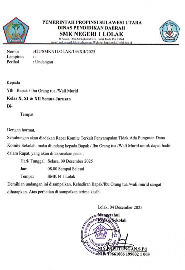 Lolak — SMK Negeri 1 Lolak mengambil langkah maju dengan memastikan tidak ada lagi pungutan atau sumbangan dana komite yang membebani orang tua siswa. Hal tersebut tertuang dalam undangan rapat Komite yang akan dilaksanakan pada Selasa, 9 Desember 2025, dengan agenda penyampaian bahwa tidak ada pungutan dana komite di sekolah.