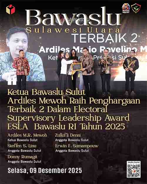 Hal ini dikatakan Ketua Bawaslu Provinsi Sulawesi Utara, Ardiles Mewoh, usai meraih penghargaan Terbaik 2 dalam ajang Electoral Supervisory Leadership Award (ESLA) 2025 yang digelar di Jakarta, Selasa (9/12/2025) malam. Penghargaan tersebut diberikan oleh Bawaslu Republik Indonesia sebagai bentuk apresiasi terhadap kepemimpinan yang berintegritas, inovatif, serta berkontribusi pada peningkatan tata kelola pengawasan pemilu.