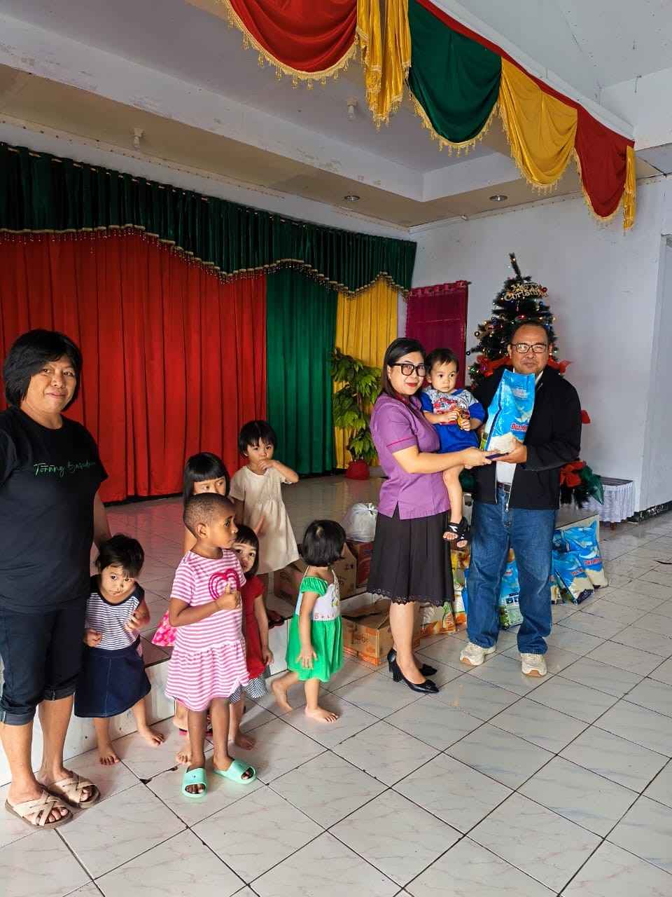 Selain menghadirkan sukacita Natal bagi anak-anak jemaat, rombongan juga menyalurkan bantuan sosial berupa beras, minyak goreng, dan gula kepada anak-anak panti asuhan sebagai wujud kepedulian dan solidaritas sosial.