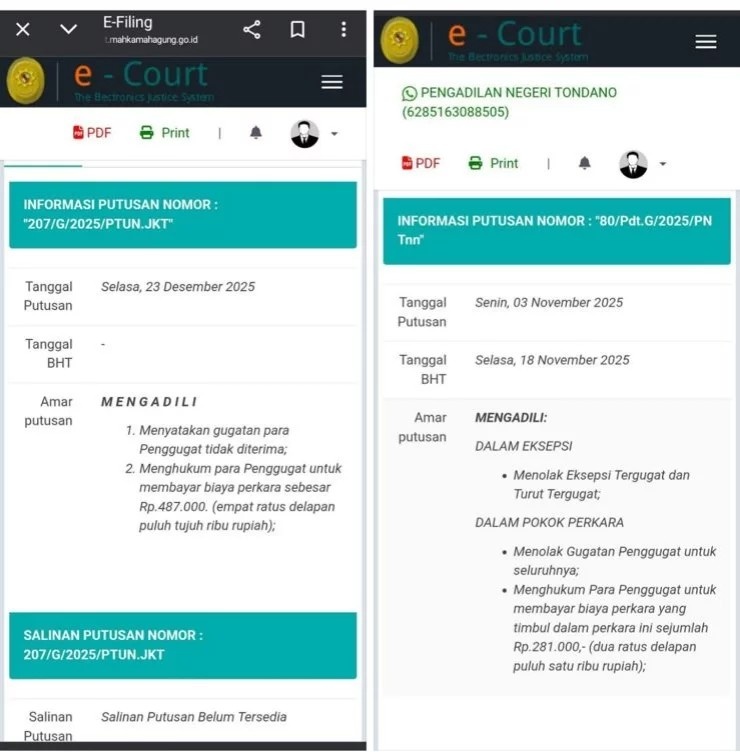 Putusan PTUN Jakarta Timur tersebut sejalan dengan putusan pengadilan lainnya. Dalam perkara terpisah, Pengadilan Negeri Tondano melalui Putusan Nomor 80/Pdt.G/2025/PN Tnn juga menolak seluruh gugatan penggugat, baik dalam eksepsi maupun pokok perkara. Pengadilan menyatakan dalil-dalil penggugat tidak beralasan hukum dan membebankan biaya perkara sebesar Rp281.000 kepada para penggugat.