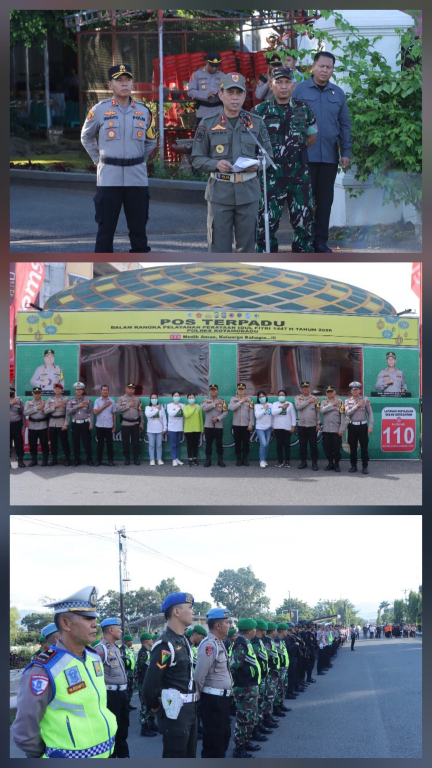 *Humas Polres Kotamobagu* – Sinergitas kokoh ditunjukkan oleh jajaran pimpinan daerah dalam menyambut perayaan Idulfitri 1447 H. Kapolres Kotamobagu AKBP Irwanto, SIK, MH hadir bersama unsur Forum Koordinasi Pimpinan Daerah (Forkopimda) dalam Apel Gelar Pasukan Kesiapan Pengamanan Pawai Malam Takbiran yang dilaksanakan di depan Rumah Dinas Walikota Kotamobagu, Jumat (20/03/2026).